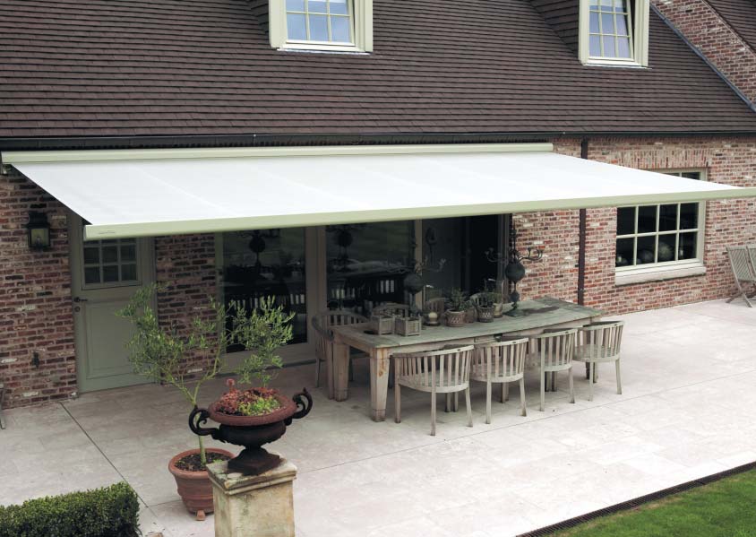 Deze zonwering beschikt daarom over zwaardere knikarmen van 71 mm hoog met 4 kabels waardoor er nog betere doekspanning ontstaat.
