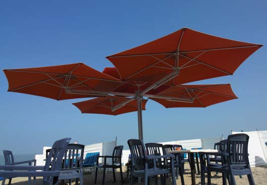 De P4 heeft een modern design en is heel gebruiksvriendelijk dankzij de geintegreerde gasveer. De telescopische arm is door middel van een hendel vergrendelbaar in drie posities. De arm kan horizontaal vergrendeld worden wanneer de parasol open is, wanneer de arm op tussenhoogte hangt kan de parasol eenvoudig opgevouwen worden of in of uit de arm genomen worden. In de verticale positie zijn zowel de arm als de parasol netjes opgevouwen.